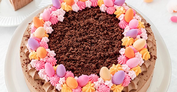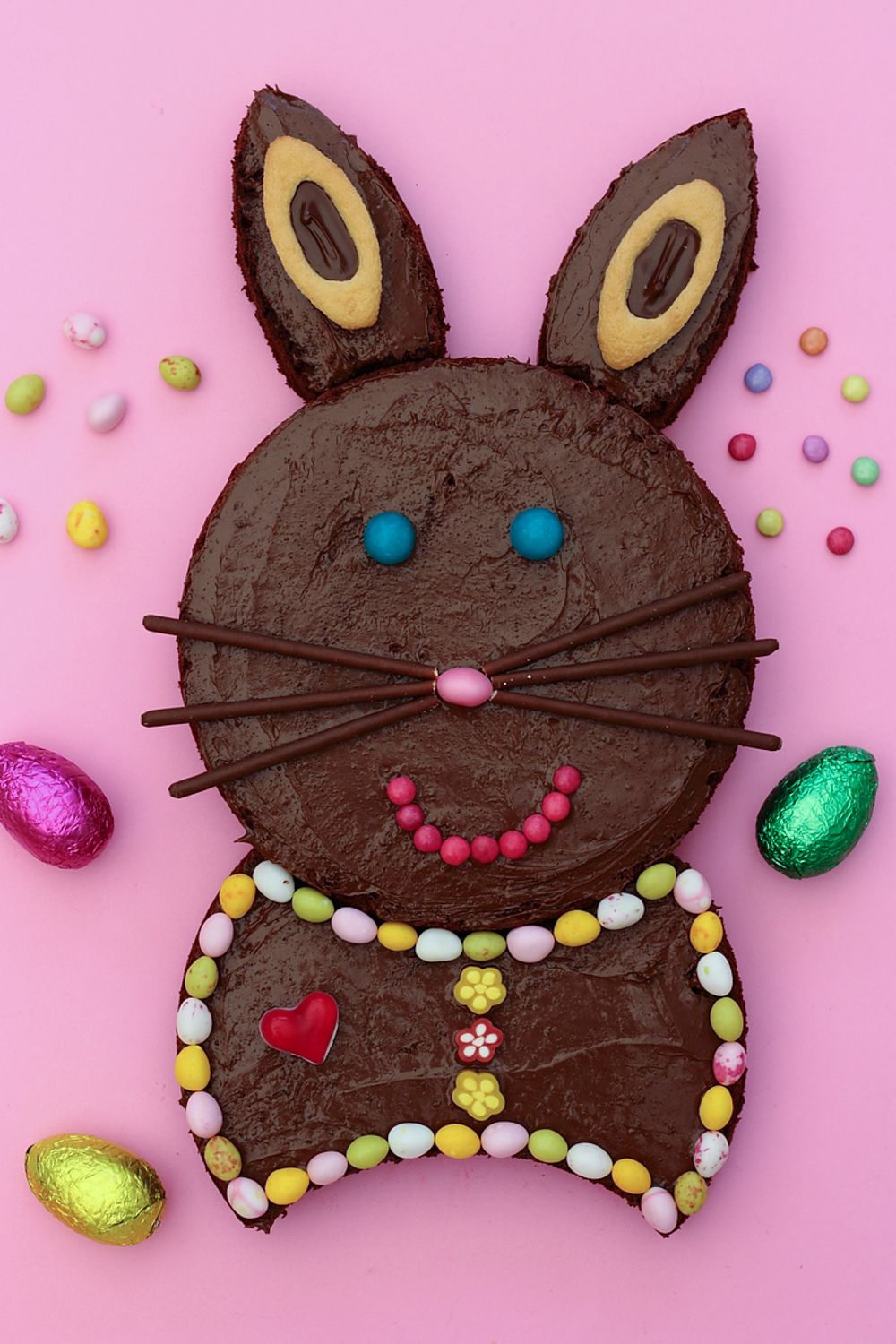 Réalisez 2 gâteau ronds à l’aide d’un moule à manqué, découpez 2 oreilles dans l’un des gâteaux et assemblez le tout sur un plat de service. Nappez avec un glaçage chocolat fondu + crème liquide et décorez avec tout ce que vous avez dans les placards !