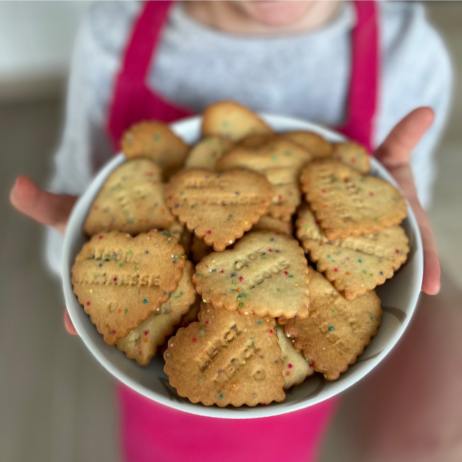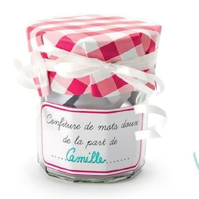 Nous sommes adeptes du « fait-maison » en cuisine et en bricolage, donc je me tourne naturellement vers des cadeaux faits avec amour : des sablés gourmands, des sablés personnalisés au prénom de la maîtresse ou avec des petits clins d’œil (bonnes vacances, bisous, etc…), ou un pot de confiture à mots doux :