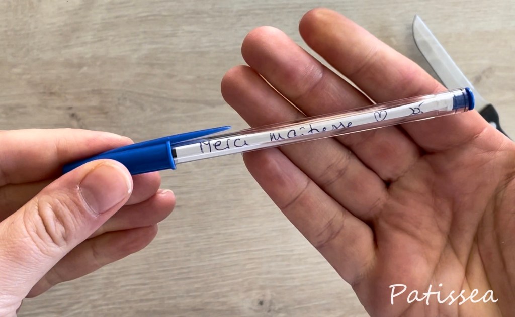 un stylo personnalisé : on retire le bouchon arrière d’un stylo bic cristal, et on insère un papier de 5mm x 10cm sur lequel l’enfant peut écrire une phrase (« merci maîtresse, « le stylo de la maîtresse », « bonnes vacances maître! »). On referme avec un point de colle, et le tour est joué !