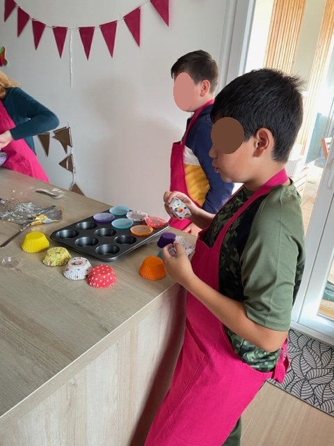 J’ai constitué 2 équipes de 3, et toutes deux ont préparé la recette, sous l’œil attentif de la maman arbitre 😉 Chacun a pu choisir ses caissettes pour remplir la plaque de cuisson, et une fois les cupcakes enfournés, nous sommes passés à l’Escape Game au salon.