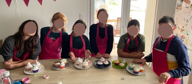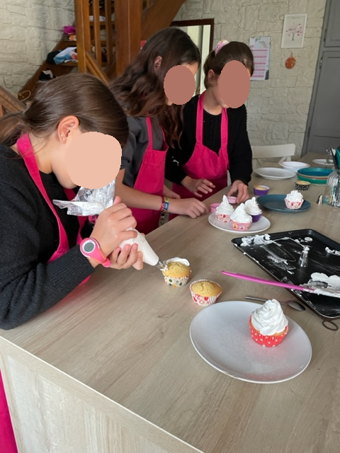 Chacun a pu s’exercer au glaçage à la poche à douille sur une plaque à pâtisserie, puis j’ai délicatement récupéré la crème à l’aide d’une spatule en silicone pour re-remplir les poches à douilles pour la décoration finale. Et là… ils m’ont épatée : ils ont fait de très beaux pochages et ont été très minutieux en saupoudrant les décors. Ils ont pris beaucoup de plaisir à faire cette activité créative.