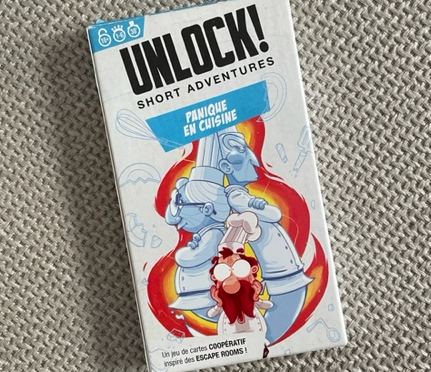 C’est un jeu d’énigmes sous forme de jeux de cartes : « Panique en cuisine » de la gamme « Unlock! Short adventures ». Un jeu de cartes coopératif composé de 30 cartes avec des énigmes à résoudre pour arriver à reproduire une recette (à partir de 10 ans).