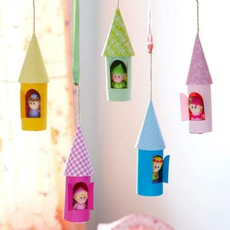 Princesses dans leur tour : un rouleau de papier toilette, un cône de papier cartonné assorti pour le toit, et des petites figurines en bois peintes