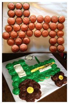 Maintenant, lancez-vous ! Faites votre dessin, positionnez vos cupcakes, et décorez-les comme sur cet exemple de gâteau tracteur en cupcakes !