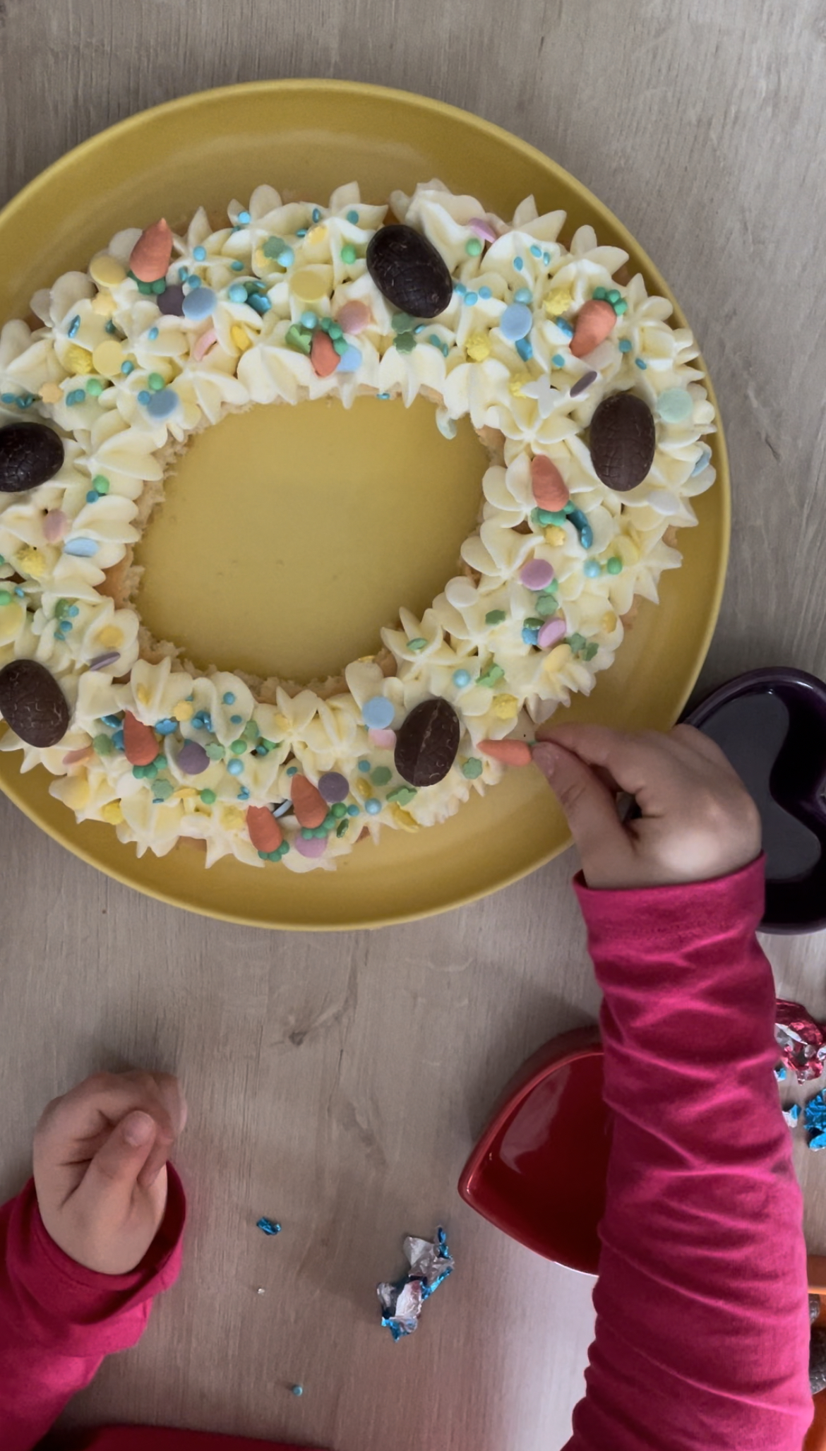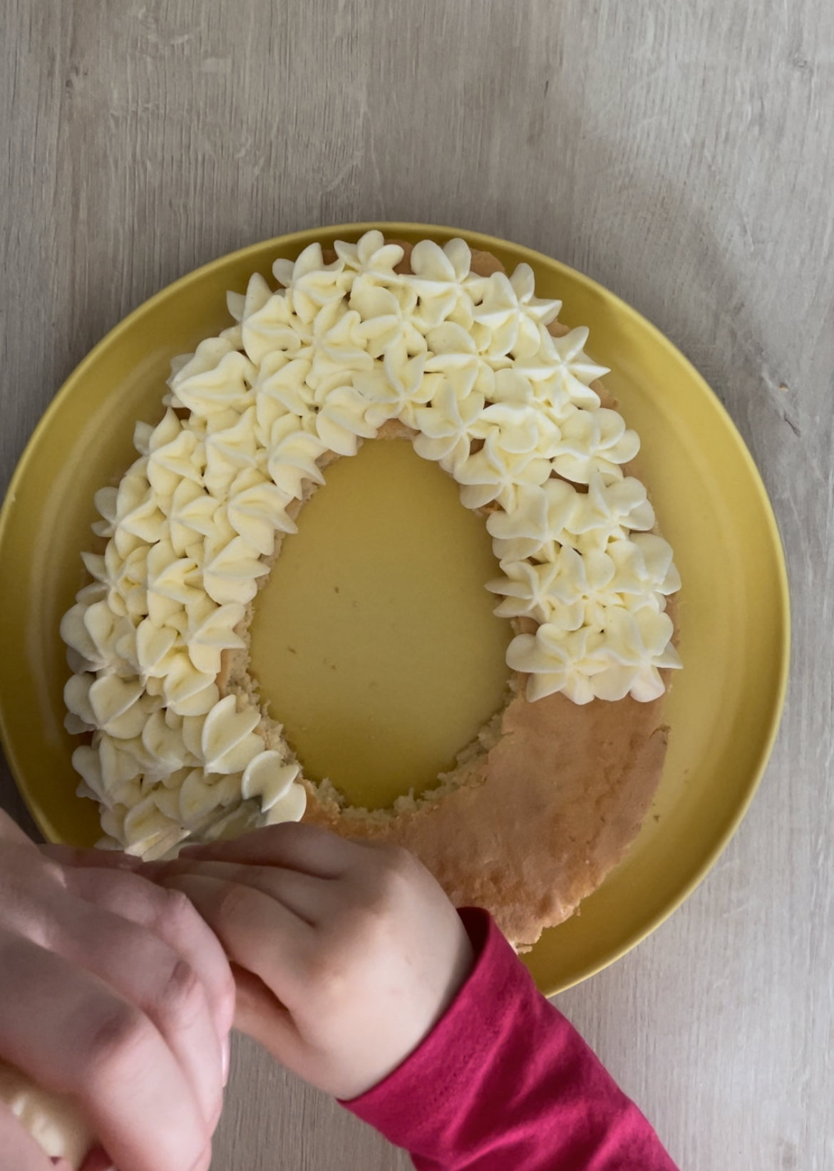 Contrairement à ce que l’on pourrait penser, l’assemblage a pris peu de temps. Une fois la génoise redécoupée en forme d’œuf, et la crème suisse refroidie et mise en poche à douille, tout va vite. Mais quel plaisir de prendre son temps à décorer à 4 mains. Un petit moment de bonheur suspendu dans une journée chargée !