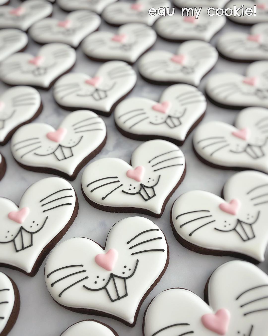 Ressortez vos emporte-pièces cœur qui prennent la poussière depuis Noël ! Un glaçage au sucre glace classique (ou glaçage royal s’il vous reste du stock!), et les dessins au feutre alimentaire ou avec du chocolat fondu (utilisez un sachet congélation comme poche à douille en découpant un tout petit trou dans un coin pour dessiner avec le chocolat fondu). Et hop, totale impro !